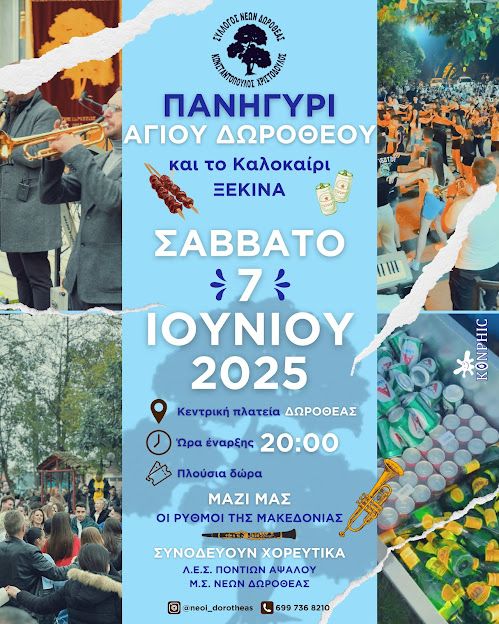 Ο Σύλλογος Νέων Δωροθέας “Κωνσταντόπουλος Χριστόδουλος” σας προσκαλεί σε μια αξέχαστη βραδιά που θα σημάνει την έναρξη του καλοκαιριού με τον πιο πανηγυρικό τρόπο! Το Σάββατο 7 Ιουνίου 2025, από τις 20:00 και μετά, η κεντρική πλατεία της Δωροθέας θα μετατραπεί σε μια ατελείωτη γιορτή μουσικής, χορού και κεφιού.